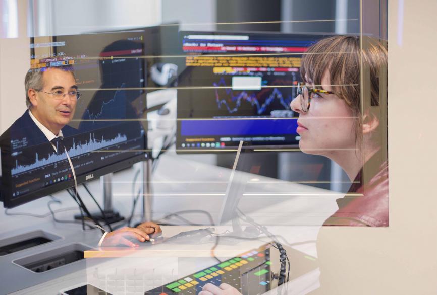 Luis Aramburu, durante una de sus clases. “Ofrecemos la misma gama de productos y herramientas informáticas sobre los que trabajamos en el entorno profesional, lo único que no es real, evidentemente, es el dinero” a lo cual, Luis Aramburu añade que “la intención es que el alumno sienta lo que supone tomar decisiones durante unos meses, cómo apostar por un activo o una zona determinada u otra”. A la hora de valorar los resultados, el docente se muestra muy satisfecho y asegura que “los alumnos han trabajado bien y se han involucrado en la actividad, de hecho, han atravesado los momentos de depresión y euforia en función de la evolución del mercado, lo cual les ha permitido aprender que el riesgo no es ni bueno ni malo, ya que lo realmente peligroso es el desconocimiento del riesgo a la hora de gestionar este tipo de proyectos”. Luis Aramburu también destaca “el interés mostrado por los alumnos en la asignatura”, a lo cual ha añadido que “es una lástima que este tipo de aspectos no se traten demasiado en los planes de estudios convencionales”.